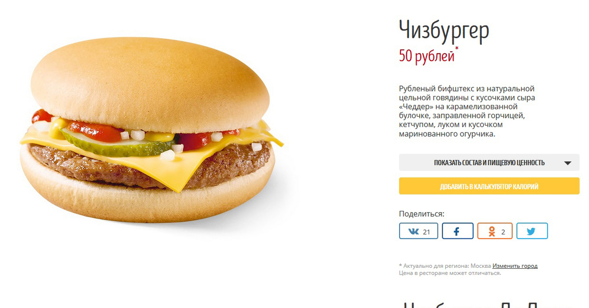 Логично, что как калорийность, так и пищевая ценность варьируется в зависимости от региона. Так в Австралии содержания белка немного выше чем в Америке. 33,7 грамма против 30, это связано с тем, что в местном мясе больше белка. В России содержание белка составляет 32 грамма, а калорийность Роял Чизбургера составляет 530 ккал.