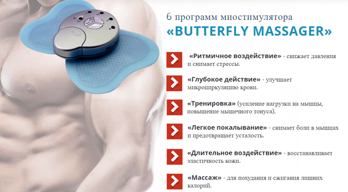 ХАРАКТЕРИСТИКИ МИОСТИМУЛЯТОРА МЫШЦ ДЛЯ ПОХУДЕНИЯ BUTTERFLY MASSAGER