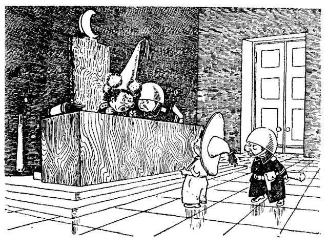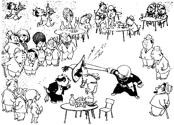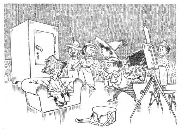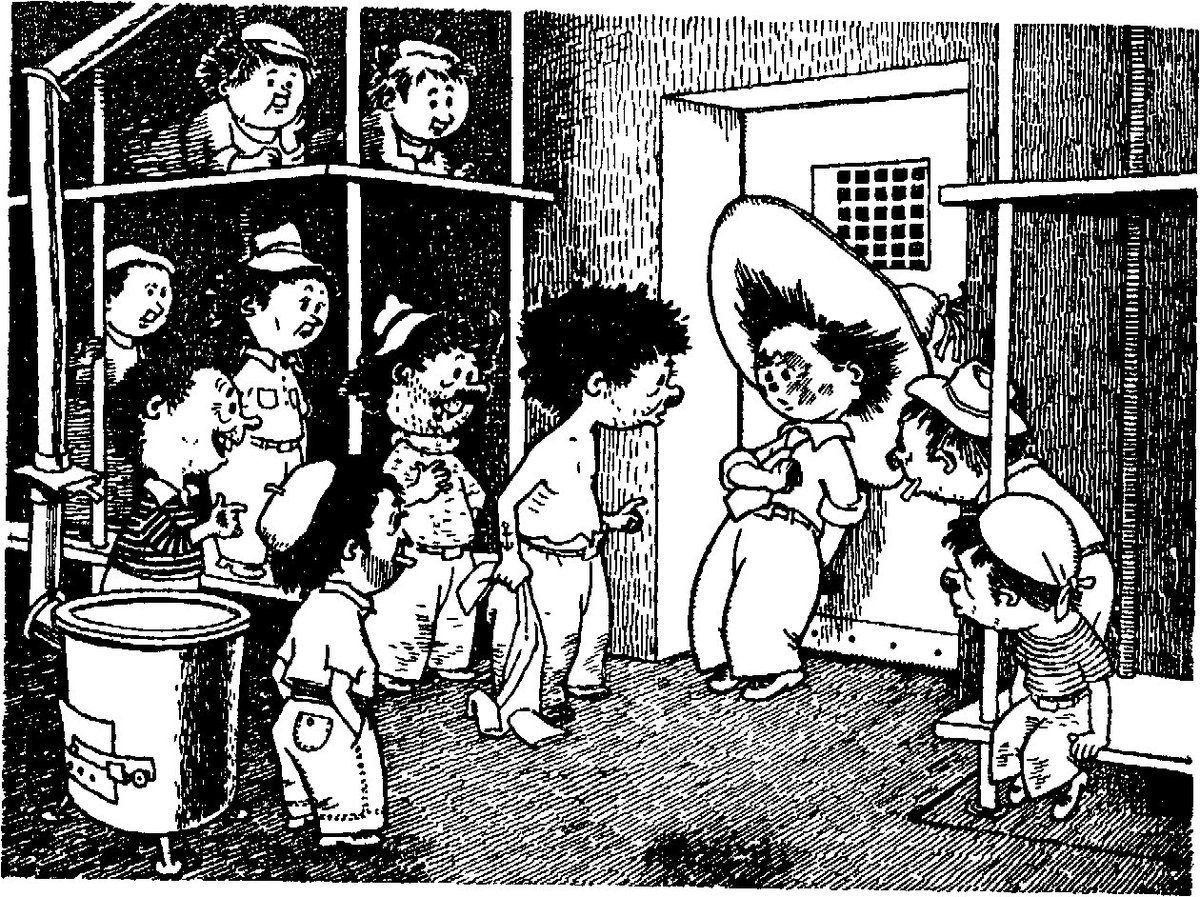 .. А это кто? — продолжают кричать Вригль, показывая на Незнайку пальцем. — Кто он такой, я спрашиваю! Кто его знает? Что он совершил?.. Пообедал бесплатно? Так за это его сюда? А ему только сюда и надо, дурачье вы этакое! Здесь ему и тепло, и светло, и блохи не кусают. Он только и мечтает, как бы скорей попасть в каталажку и начать объедать полицию! Это не настоящий преступник, а шантрапа с пустыми карманами. Что с него возьмешь,когда у него даже на обед денег нет?».