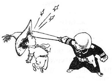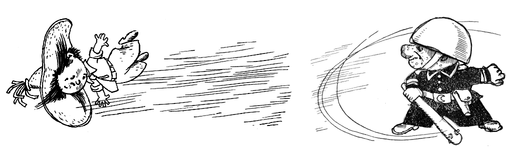 — «Резиновая палка»! — передразнил полицейский. — Вот и видно, что ты осел! Это усовершенствованная резиновая дубинка с электрическим контактом. Сокращенно — УРДЭК. А ну-ка, стой смирно! — скомандовал он. Р-р-руки по швам! И никаких р-разговоров!