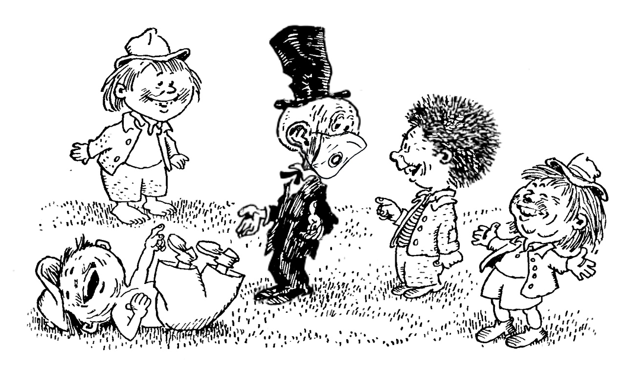 Во-первых, Крабс. Пройдоха, облапошивший Спрутса, Скуперфильда, Мигу и Жулио. Во-вторых, собственно Мига и Жулио. Мига, который за пару часов провел акцию по созданию фейкового события планетарного масштаба, мастерски манипулирующий толпой и умеющий находить выгоду даже в критической ситуации. Жулио – террорист, снабжавший оружием криминалитет, у которого на складе был неограниченный запас огнестрельного оружия, динамит, и даже небольшая пушка. Он организовывает бандитскую экпроприацию скафандра Незнайки из поместья Клопса. Именно он планирует и курирует террористический акт против пришельцев. Черные быстро бегающие глаза, черная бородка и усики – настоящий кавказский боевик, которому и Тифлисский банк ограбить – раз плюнуть. Мне кажется, эти трое рано или поздно друг друга найдут и сколотят на пепелище старого мира новое правительство. Друг друга они любить не будут и при первой возможности один из них расправятся с двумя остальными. Мне кажется, что это будет именно Жулио.