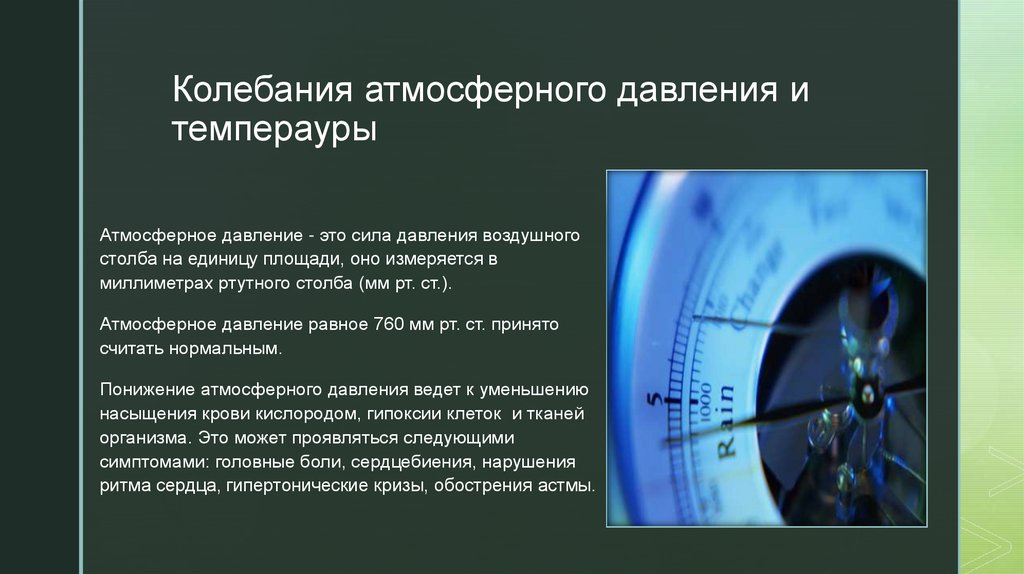 Атмосферное давление на уровне моря зависит от географического положения, температуры и влажности воздуха, а также от погодных условий.На самом деле изменение атмосферного давления на уровне моря обычно указывает на грядущее изменение погоды. Поскольку температура и влажность воздуха, а также погода меняются в зависимости от сезона (т.е. зима, весна, лето и осень), атмосферное давление на уровне моря также меняется в зависимости от времени года.