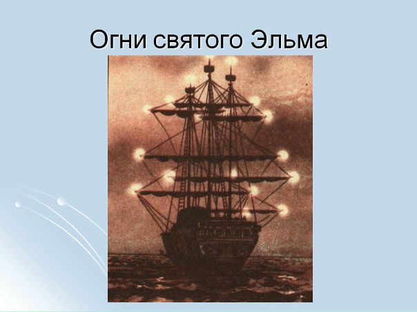 Огни святого Эльма — бледно-голубые язычки пламени на концах мачт и рей кораблей, вокруг самолетов, летящих сквозь тучу, на вершинах гор, иногда на листьях, траве, рогах животных.Огни святого Эльма известны «общественности» благодаря морским мифам, в которых утверждается, что, во-первых, огни появляются накануне грозы, во-вторых, это добрый знак, указывающий, что покровитель моряков — святой Эльм рядом и не даст корабль в обиду злым силам океана.
