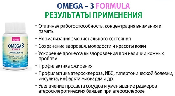Отмечаются нормализация кровяного давления, улучшается зрение, отмечается снятие воспалительных процессов в суставах, улучшение мыслительных процессов, как следствие лучшей работы мозга. Омега-3 способствует укреплению иммунитета, помогая при лечении кожных заболеваний, экземе, аллергии, болезни Альцгеймера. Некоторые исследования указывают на улучшение состояния при лечении рака груди. При всех своих положительных качествах Омега-3 еще и выводит из организма холестерин и свободные радикалы, являясь прекрасным антиоксидантом.