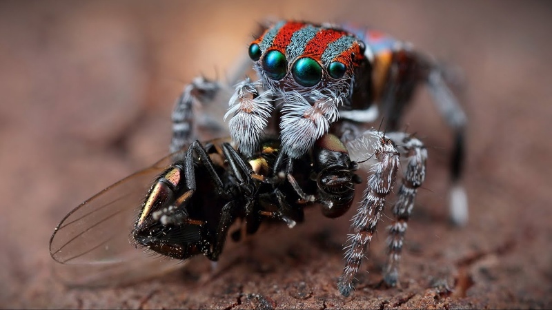Например, Павлиний паук. Он обитает в Австралии и на самом деле похож на павлина не только необычной расцветкой, но и повадками. Он раскрашен во все цвета радуги и, так же как и павлин, ухаживает за самкой, распушая свои чешуйки и исполняя специальный танец.