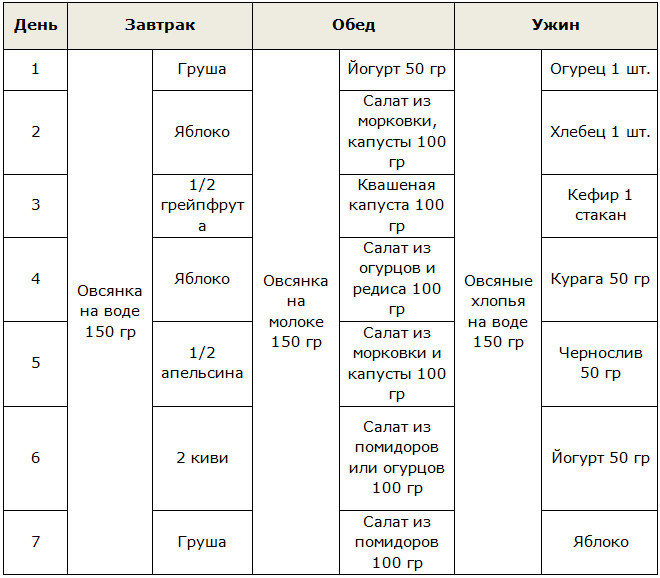 Эта перловая диета рассчитана на 5-7 дней. Ее приблизительное дневное меню: завтрак: каша из основного продукта и зеленое яблоко в тертом виде, перемешанное с крупой; обед: в «коронное» блюдо можно добавить 4 столовых ложки отварной моркови или свеклы, если нет возможности обходиться без животных белков, добавить в рацион 100 г куриной грудки или постной рыбки; ужин: дополнить рацион стаканом кефира и смешать крупяное блюдо с горсточкой рубленого чернослива.