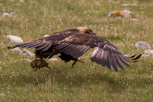 Беркут весит около пяти килограммов, поэтому в силу законов аэродинамики не может поднять груз тяжелее себя. Полые кости дают ему возможность долго парить в небе на восходящих потоках. Он может набрать высоту около двух километров.