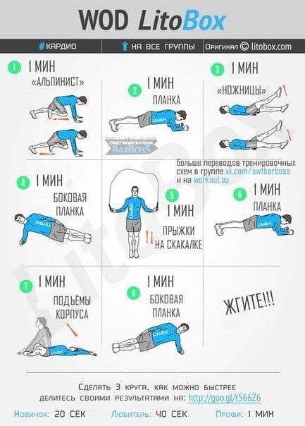Выполните 20 повторений, а затем сразу переходите к следующему движению (вы делаете от шести до восьми в сумме).Когда вы выполните все упражнения, отдохните от 30 секунд до одной минуты. Затем повторите еще два раза, всего три раунда.