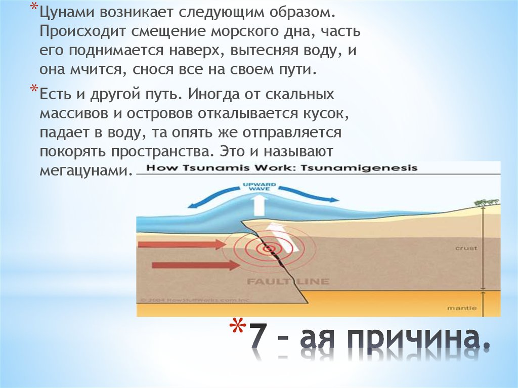 Наиболее частой причиной цунами является подводное землетрясение, которое приводит к внезапному поднятию или падению части земной коры под океаном или вблизи него. Это землетрясение создает взрывное вертикальное движение, которое может сместить вышележащую толщу воды, создавая подъем или падение уровня океана выше.Это повышение или понижение уровня моря является начальным импульсом, который порождает волну цунами.