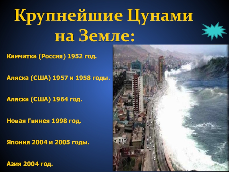 Возникновения гигантских волн, возникающих и обрушивающихся на сушу с небольшим промежутком времени получило название цунами. Главной особенностью таких волн является то, что они возникают от самого дна и поднимаются вплоть до поверхности воды. Наибольшую скорость развивают волны Тихого океана.