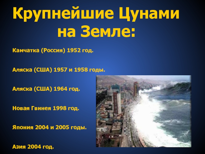 В текущем столетии можно отметить три случая наиболее сильных цунами, принесших значительный материальный ущерб и человеческие жертвы.