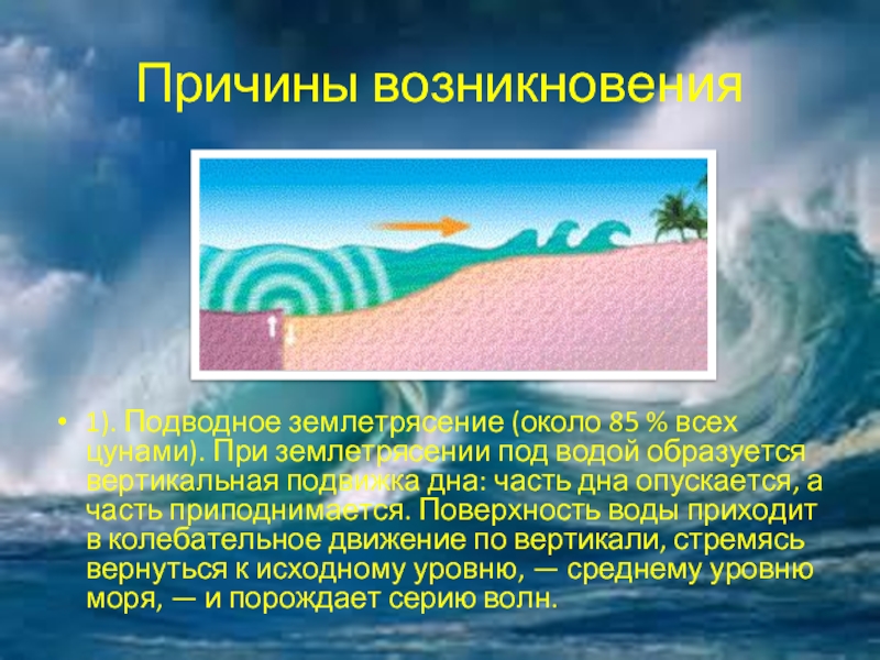 Наиболее частой причиной цунами является подводное землетрясение, которое приводит к внезапному поднятию или падению части земной коры под океаном или вблизи него. Это землетрясение создает взрывное вертикальное движение, которое может сместить вышележащую толщу воды, создавая подъем или падение уровня океана выше.Это повышение или понижение уровня моря является начальным импульсом, который порождает волну цунами.