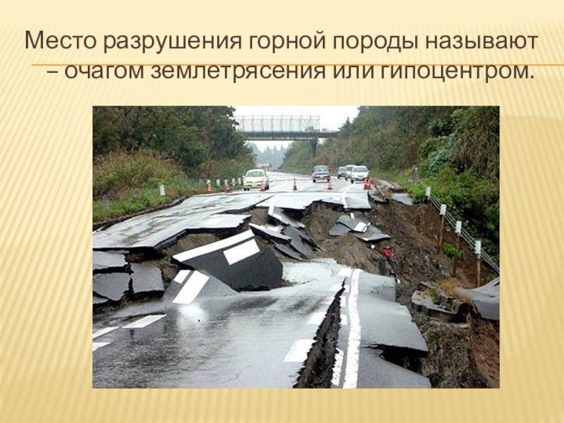 Место, где произошло разрушение горной породы, называется очагом землетрясения или гипоце́нтром.