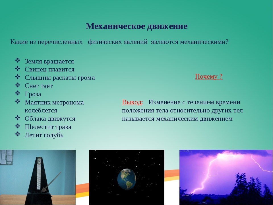Механические явления — это явления, происходящие с физическими телами при их движении относительно друг друга (обращение Земли вокруг Солнца, движение автомобилей, качание маятника).
