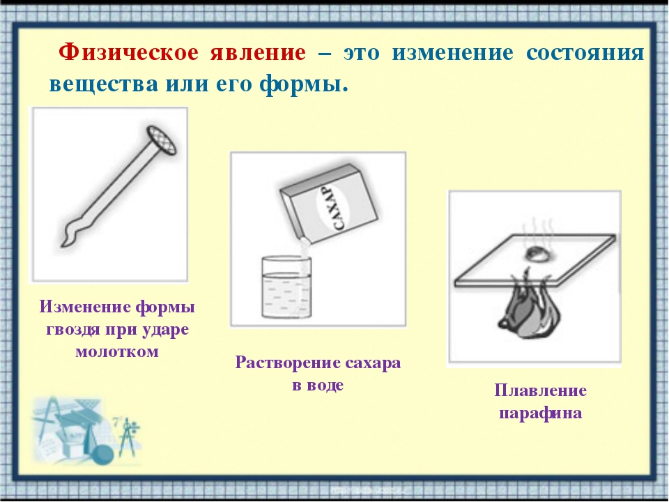 Физические явления — явления, во время которых новые вещества не образуются, но изменяются размеры, форма, размещение, агрегатное состояние тел и веществ.