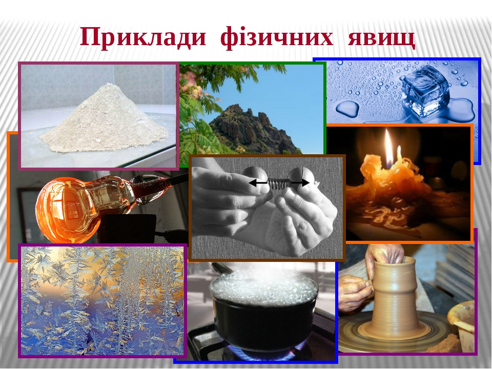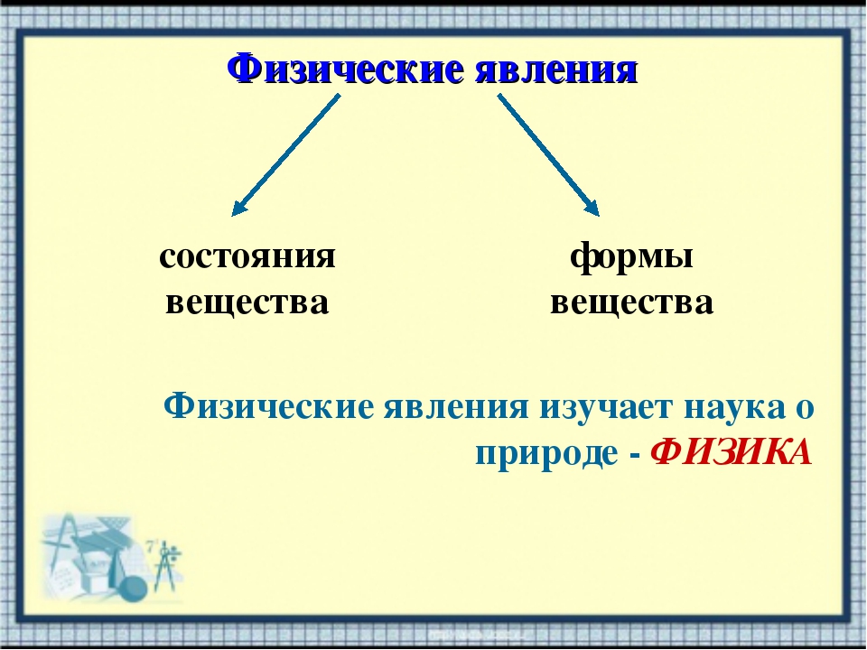 Физические явления — явления, во время которых новые вещества не образуются, но изменяются размеры, форма, размещение, агрегатное состояние тел и веществ.