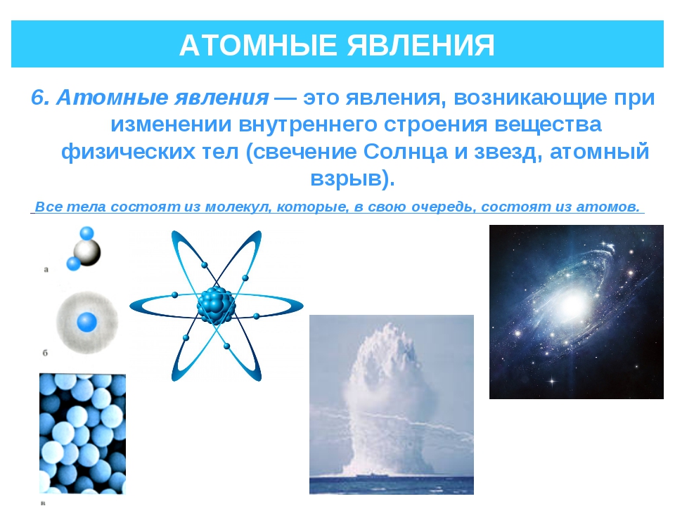 Атомные явления — это явления, возникающие при изменении внутреннего строения вещества физических тел (свечение Солнца и звезд, атомный взрыв).