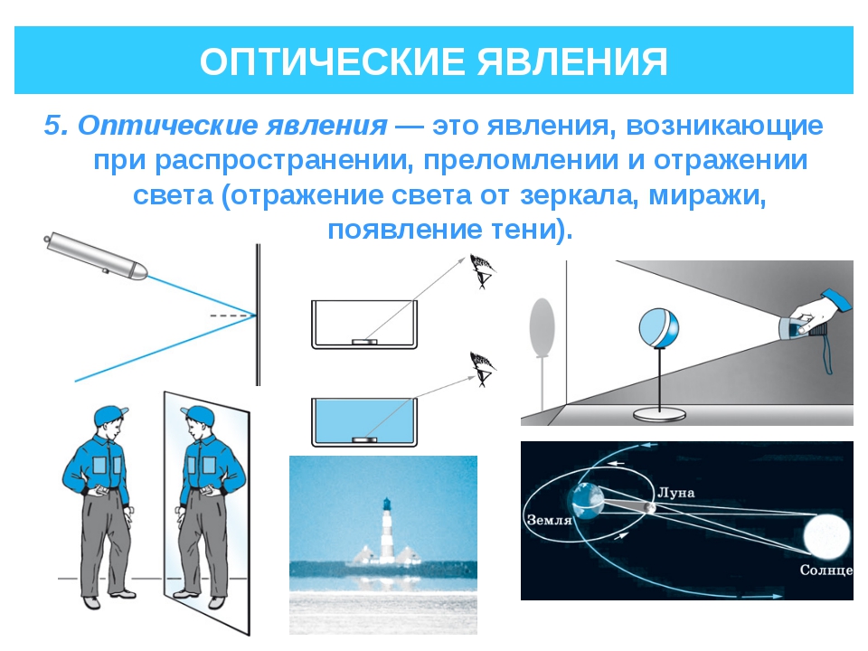 Оптические явления — это явления, возникающие при распространении, преломлении и отражении света (отражение света от зеркала, миражи, появление тени).