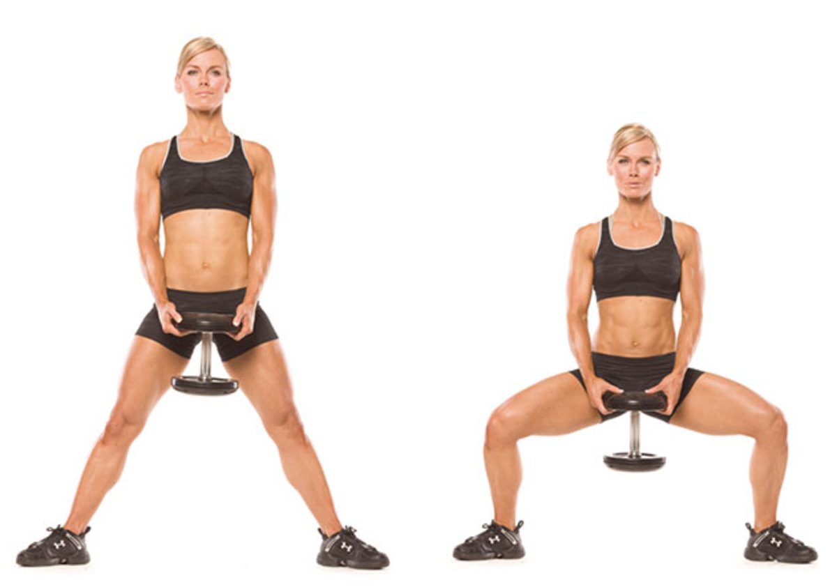 Также можно использовать 1 гантель, которую следует держать на вытянутых руках между ног. Ноги расставьте максимально широко, носки разверните в разные стороны. Голову и спину держите прямой.