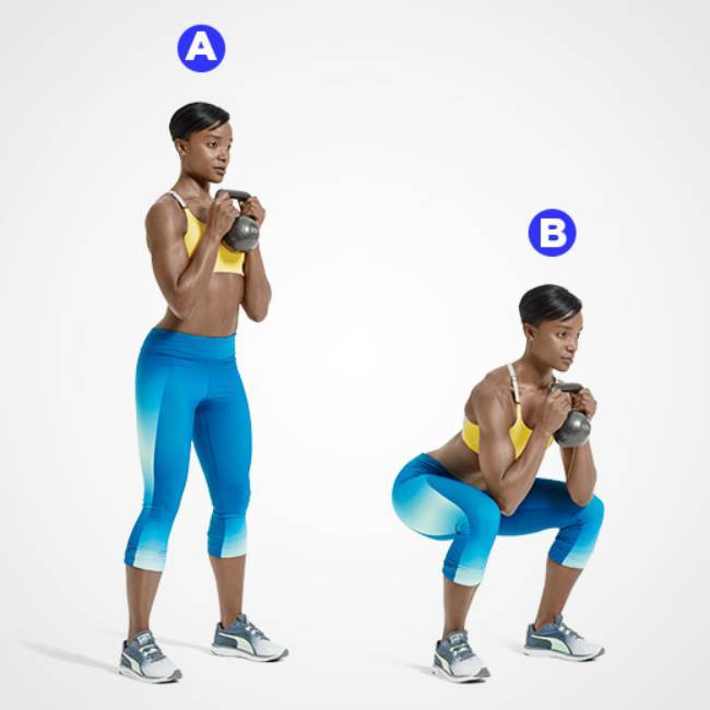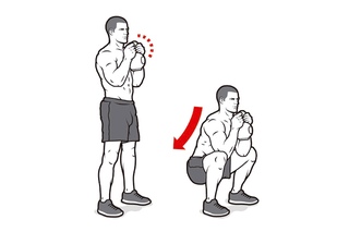 Возьмите гирю обеими руками от рукоятки к груди. Убедитесь, что ваши локти направлены вниз. Сядьте на пятки, напрягая кор и ягодицы. Не отрывайте ноги от земли, когда приседаете, удерживая гирю. Следите за тем, чтобы ваши лодыжки и колени не прогибались внутрь. Смотрите вперед и держите грудь приподнятой, а спину прямой. Встаньте обратно в исходное положение.