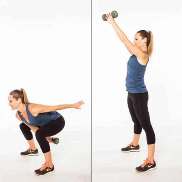 Шаг 3: Оттолкнитесь пятками и вытяните ноги, чтобы вернуться в исходное положение. Одновременно выжмите гирю над головой так, чтобы рука была параллельна уху.