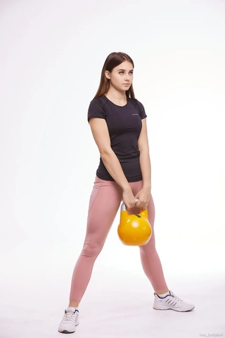 Исходное положение: умеренно широкая стойка. Держите гирю за ручку обеими руками. Ваша спина должна быть прямой, плечи опущены, пресс напряжен, смотрите вперед.