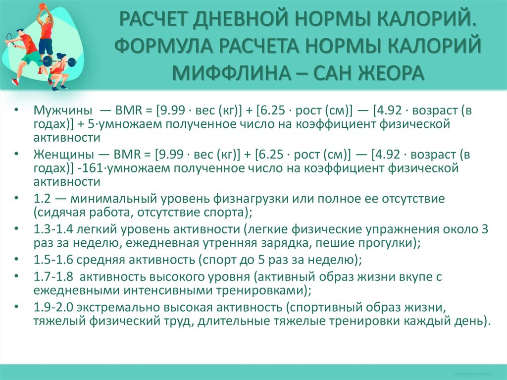 Высокоточный калькулятор зависит от уравнения Миффлина-Сент-Джора, которое, как было показано, является точным способом определения потребностей в потреблении калорий в нескольких оптимистичных исследованиях. Иногда этот инструмент относится к базе калькулятор калорий, поскольку он суточная норма калорий калькулятор в соответствии с BMR или (базовыми метаболическими показателями) и уровнями активности.