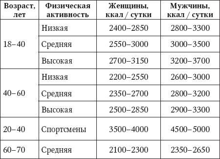 Рекомендуемые калории в день в зависимости от нескольких факторов, таких как: