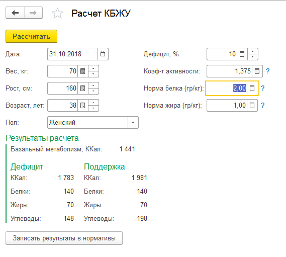 Если сложить калорийность всех продуктов, которые вы съедаете за день, получится суточная калорийность рациона питания. Рекомендуемое Минздравом РФ значение — 2500 ккал/сутки, а по европейским нормам — 2000 ккал. Более точно оценить потребность организма в энергии пищи можно оценить с помощью специального калькулятора, основанного на эмпирических формулах, предложенных диетологами.