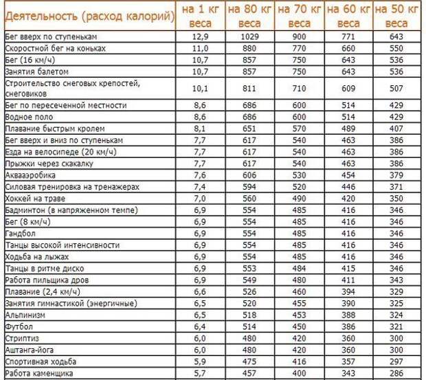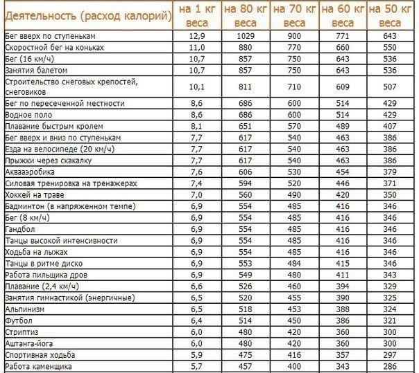 | Пешие прогулки: по пересеченной местности | 104 | 83 | 69 | 60 | 52 | 42 | 35 |