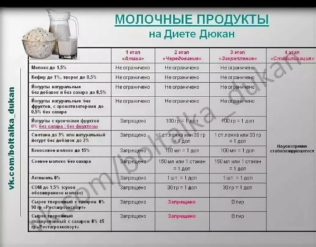 В отличие от Аткинса, диета Дюкана ограничивает жиры и полностью исключает овощи на первом этапе с постепенным повторным введением некоторых фруктов, овощей и углеводов на последующих этапах диеты.Считается, что фаза стабилизации — последняя из четырех фаз — вызывает больше всего проблем. Это потому, что трудно повторно ввести более широкий выбор продуктов питания, не набирая вес, и многим последователям трудно придерживаться специального еженедельного «белкового дня».