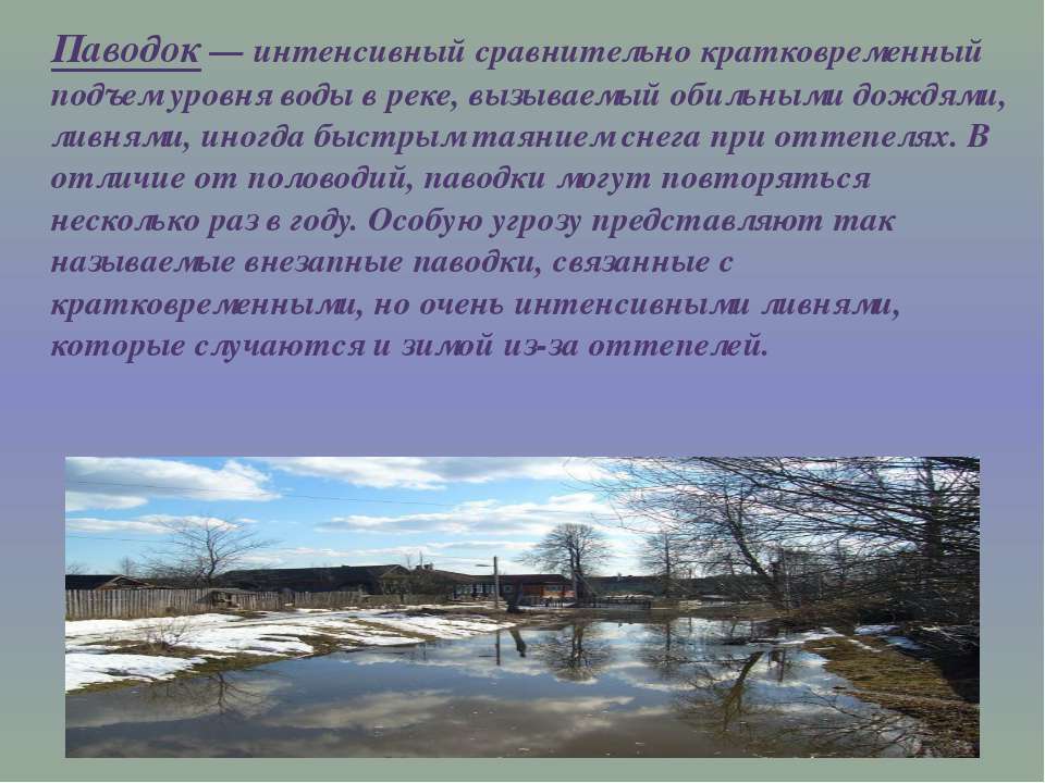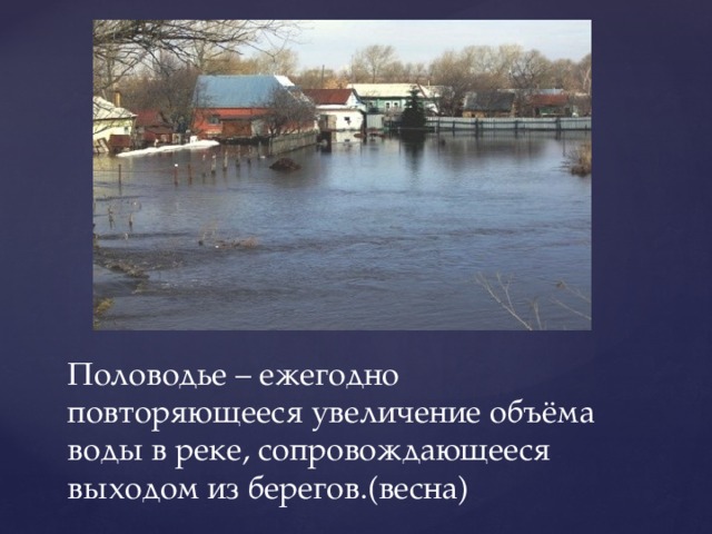 - половодье – наводнение, возникающее в результате таяния снега и выходом водоёма из естественных берегов