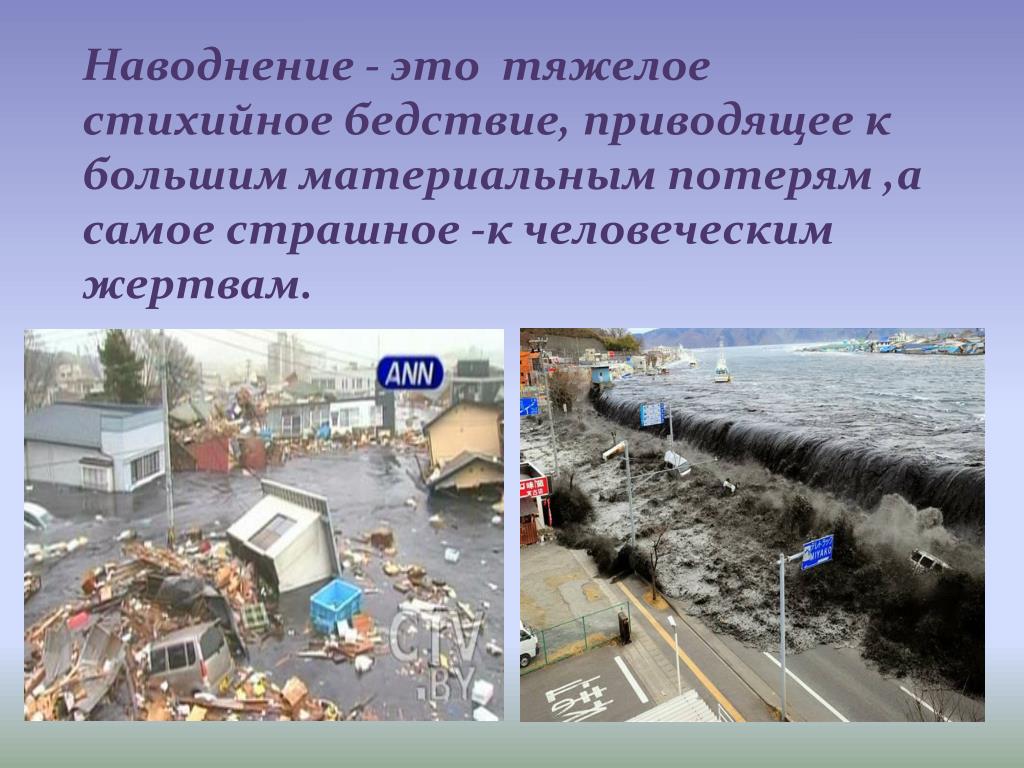 Наводнения являются одним из самых распространённых стихийных бедствий. Они составляют 19% от общего числа природных катастроф. Наводнением называется затопление суши, происходящее в результате сильного подъёма уровня воды в реке, озере или море (разлива), из-за таяния снега или льда, а также сильных и продолжительных дождей.