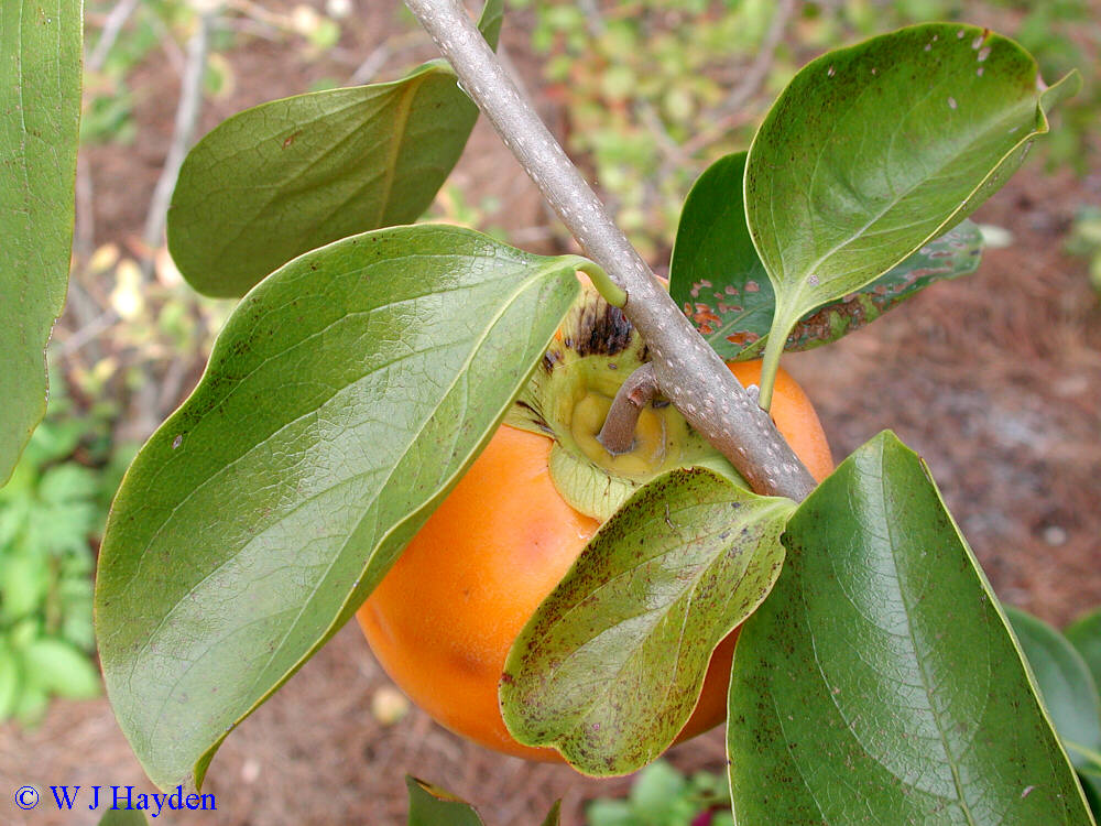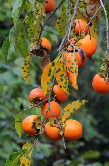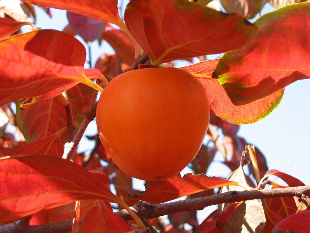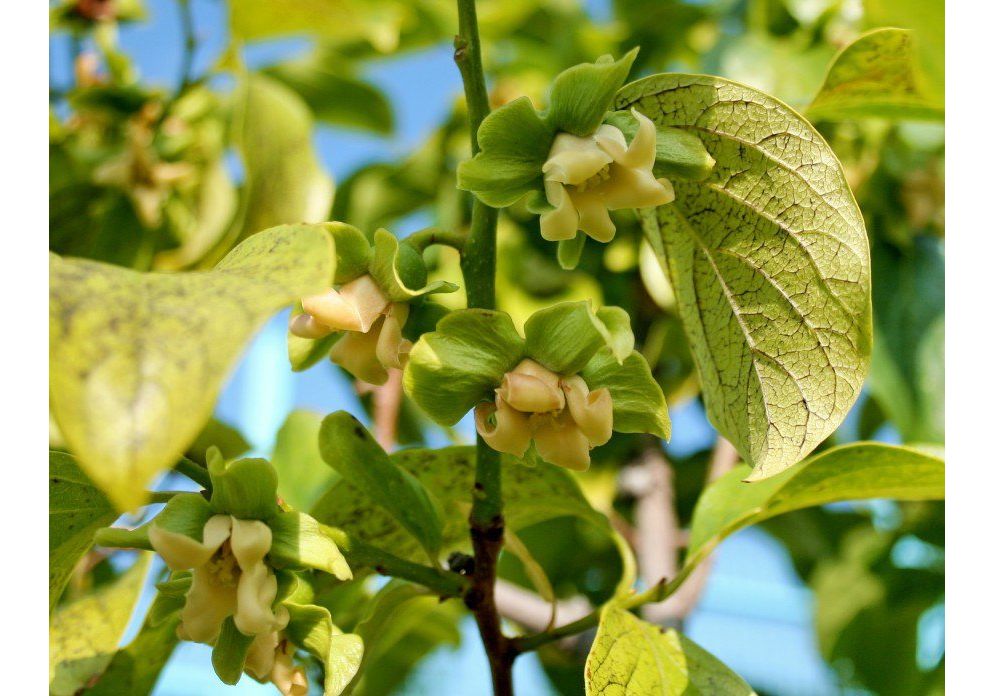 Листья крупные, блестящие, с обратной стороны бархатистые. С приходом осени они постепенно приобретают все оттенки желтого, оранжевого и красного.Вид представлен несколькими сортами, самыми известными из которых являются: Королек, израильский Шарон и Персимона.