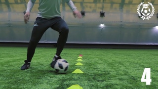 Упражнение по дриблингу в футболе «Фигурка восемь» — хорошее изменение для вплетения конусов и выходов из них, а также отлично подходит для ведения внутренней и внешней стороной стопы.