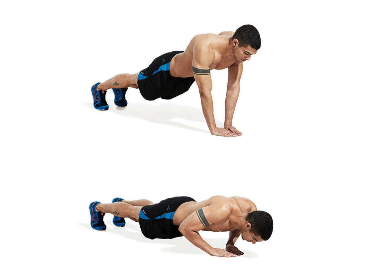 В этом варианте отжимания задействуются косые мышцы живота, также известные как боковые мышцы пресса. Стремитесь подвести колено к локтю как можно ближе, чтобы по-настоящему сжать эти стороны. Этот вариант также поможет вам улучшить глубину отжиманий, заставив вас опускаться ниже.