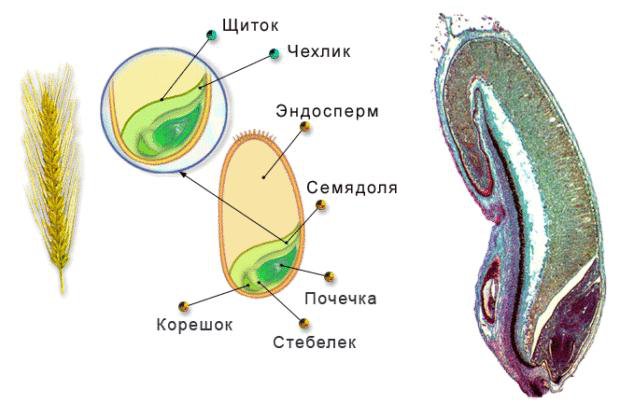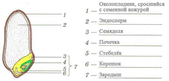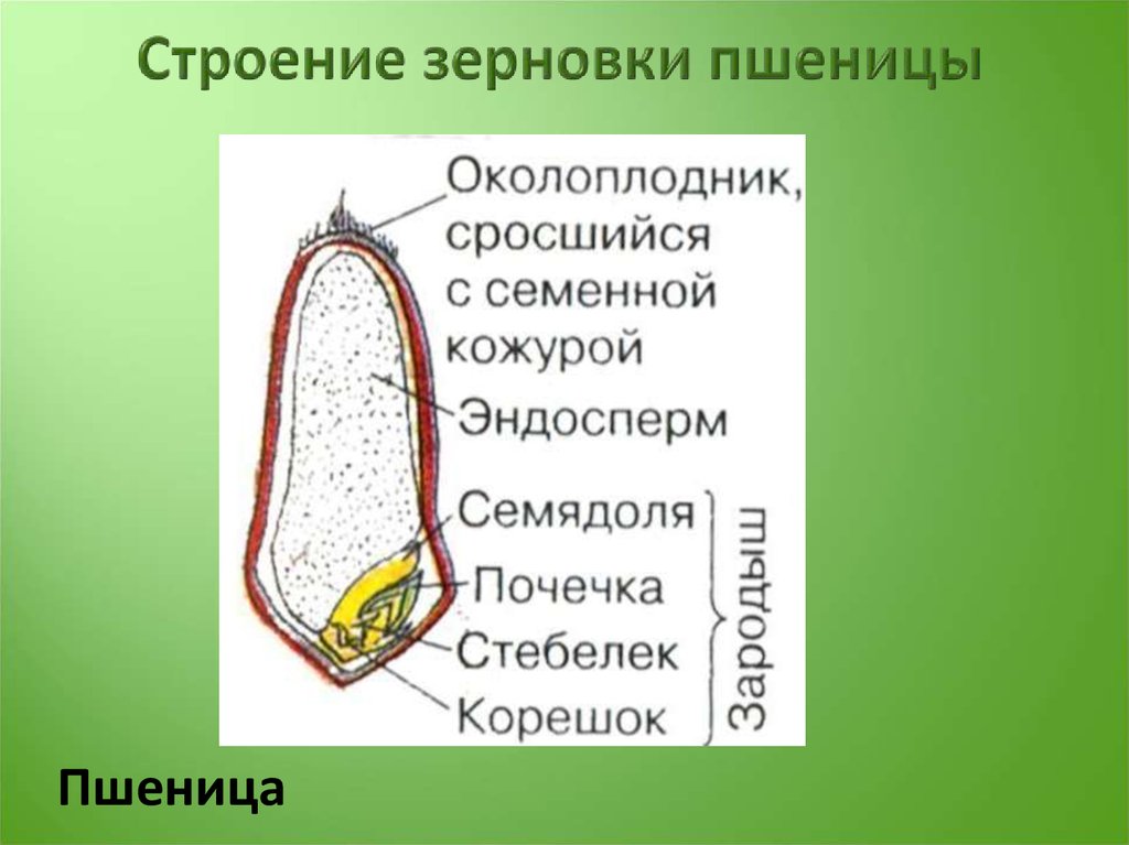 | Пшеница | Зародыш, семенная кожура, эндосперм | Одна семядоля, почечка, стебелёк, корешок | Эндосперм |