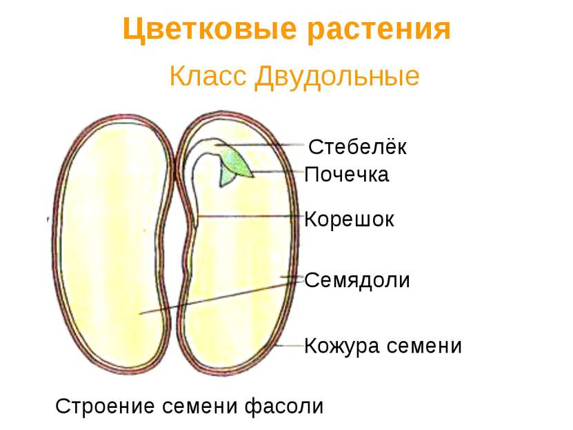 | Фасоль | Зародыш, семенная кожура | Стебелёк, почечка, корешок, две семядоли | Семядоли |