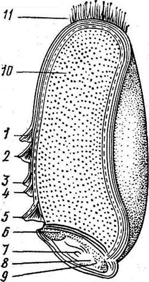 У типичного цветкового растения, или покрытосеменных, семена образуются из тел, называемых семязачатками, содержащихся в завязи, или базальной части структуры женского растения, пестика.Зрелая яйцеклетка содержит в своей центральной части область, называемую нуцеллусом, которая, в свою очередь, содержит зародышевый мешок с восемью ядрами, каждое с одним набором хромосом (то есть они являются гаплоидными ядрами). Два ядра около центра называются полярными ядрами; яйцеклетка, или оосфера, расположена рядом с микропиларовым («открытым») концом семяпочки.