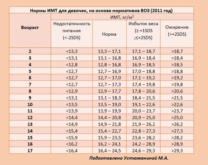 | 16—18,5 | Недостаточная (дефицит) масса тела |