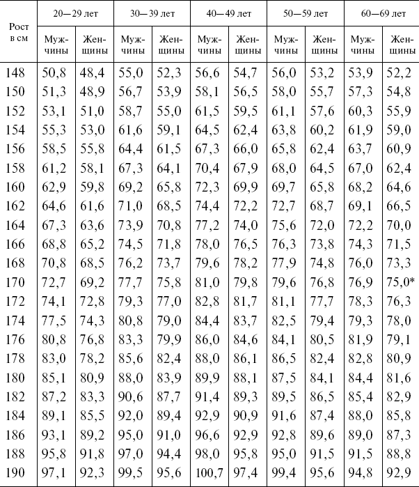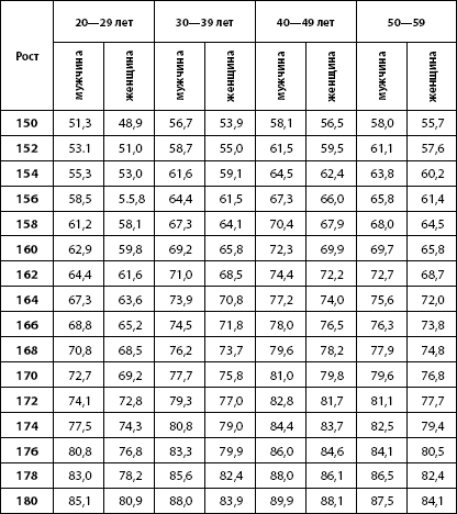 Женщины 20-30 летние должны весить на 10-12% меньше этого показателя, а в возрасте после 50 лет вес увеличивается на 5-7%.