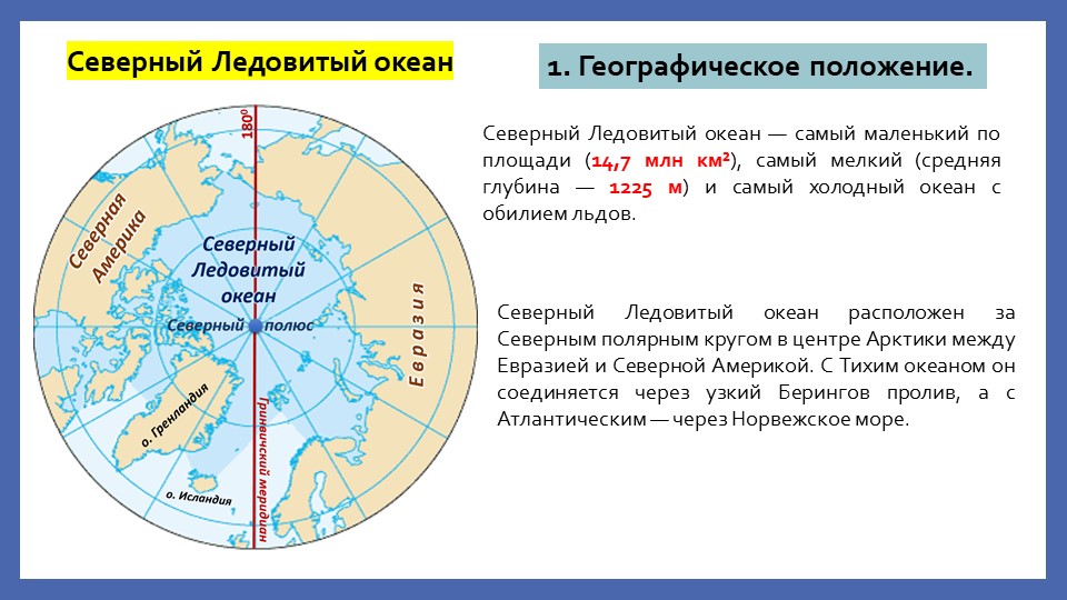 Дополнительная информация: Северный Ледовитый океан наименее изученный из всех остальных; зимой почти вся его поверхность покрыта дрейфующими льдами, часто встречаются айсберги, дрейфующие до 6-ти и более лет.