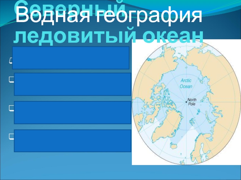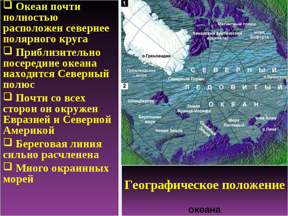 Дополнительная информация: Северный Ледовитый океан наименее изученный из всех остальных; зимой почти вся его поверхность покрыта дрейфующими льдами, часто встречаются айсберги, дрейфующие до 6-ти и более лет.