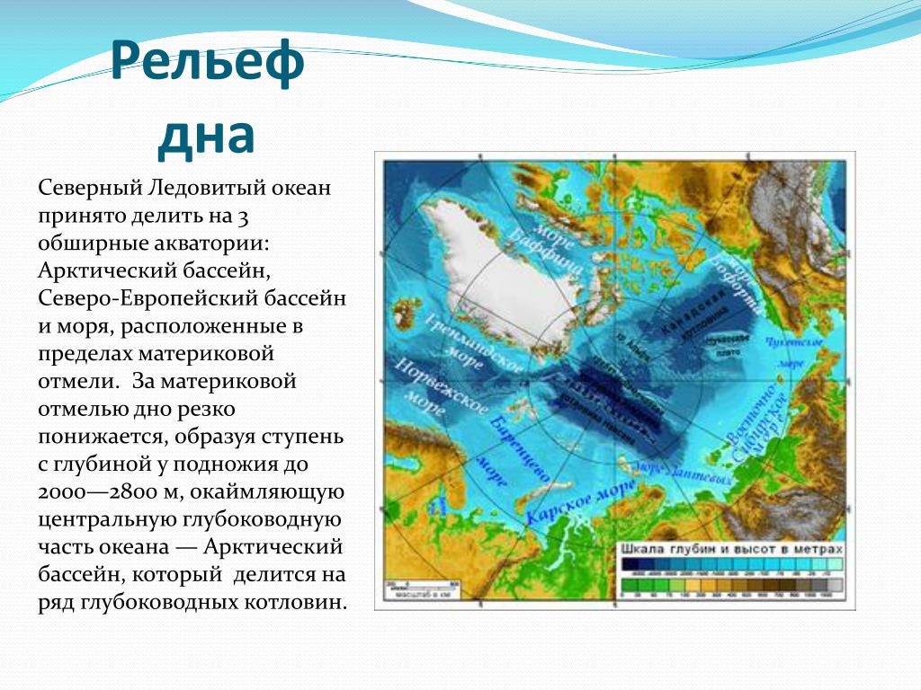 Рельеф дна: Арктический глубоководный бассейн, Северо-Европейский бассейн, материковые отмели; хребты Гаккеля, Ломоносова, Менделеева; котловины Нансена Амундсена, Макарова, Канадская, котловина Подводников и другие.