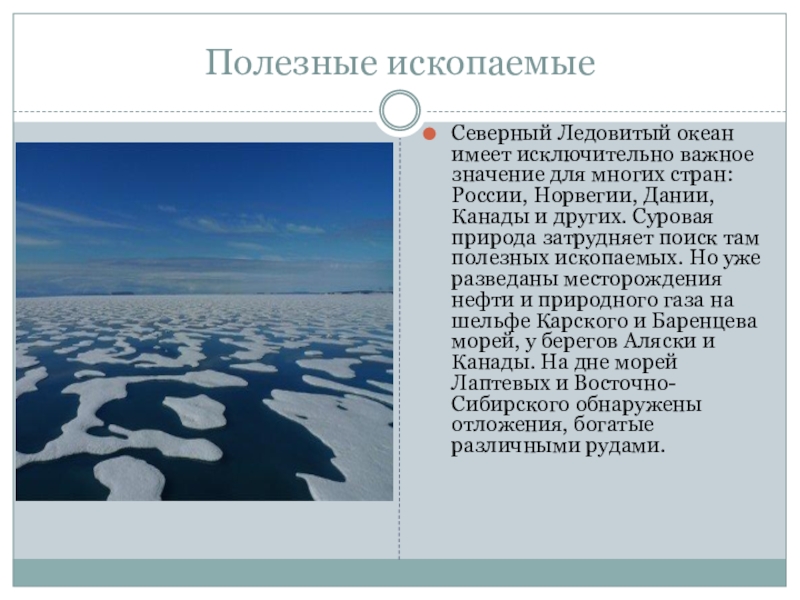 Северный Ледовитый океан имеет исключительно важное значение для многих стран: России, Норвегии, Дании, Канады и других. Суровая природа затрудняет поиск там полезных ископаемых. Но уже разведаны месторождения нефти и природного газа на шельфе Карского и Баренцева морей, у берегов Аляски и Канады. На дне морей Лаптевых и Восточно-Сибирского обнаружены отложения, богатые различными рудами.