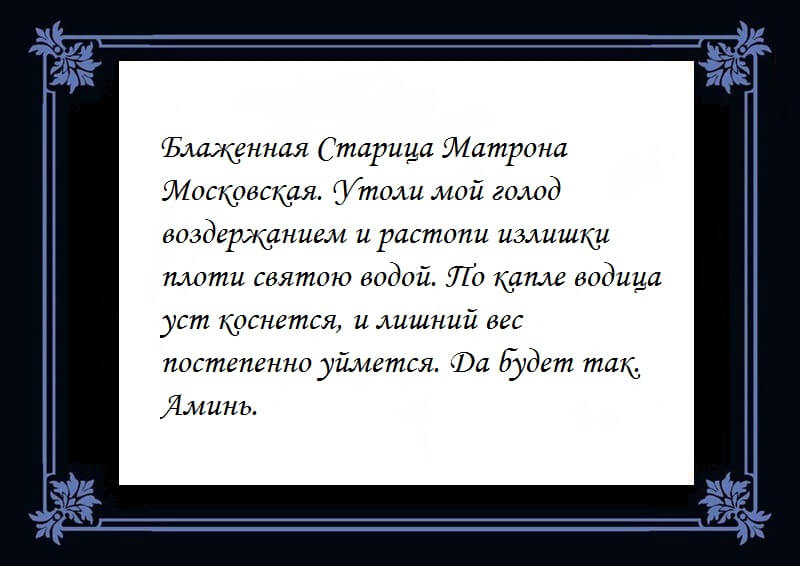 «Матрона Московская, помоги мне очистить плоть от воды и жира, от полноты и пира. Аминь».