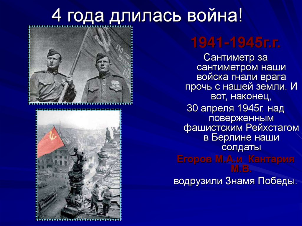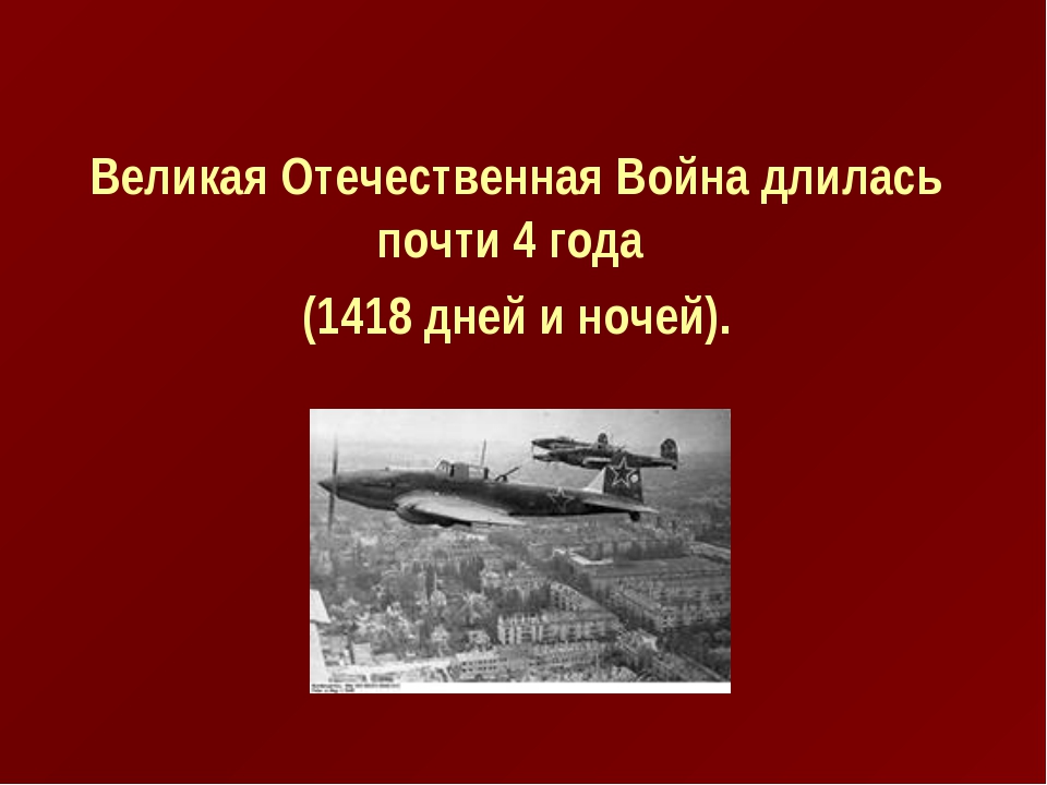 3. Великая Отечественная война началась 22 июня 1941 года в 4 часа утра вероломным нападением немецко-фашистских войск гитлеровской Германии на СССР, и продолжалась 3 года 10 месяцев и 18 дней или 1418 дней и ночей, завершившись восстановлением государственной границы СССР от Баренцева до Черного моря к 7 ноября 1944.