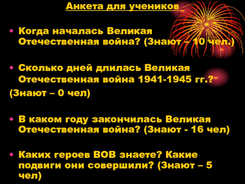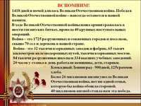 Когда началась Великая Отечественная война? Сколько лет длилась война? А когда началась Вторая мировая? Кто напал на нашу страну? Какой город выдержал 900 – дневную блокаду фашистов, но не сдался врагу? Какая крепость первой приняла на себя удар врага? Какая битва стала переломным моментом Великой Отечественной и Второй мировой войны? Ответы на эти вопросы Обязаны знать мы и наши дети.