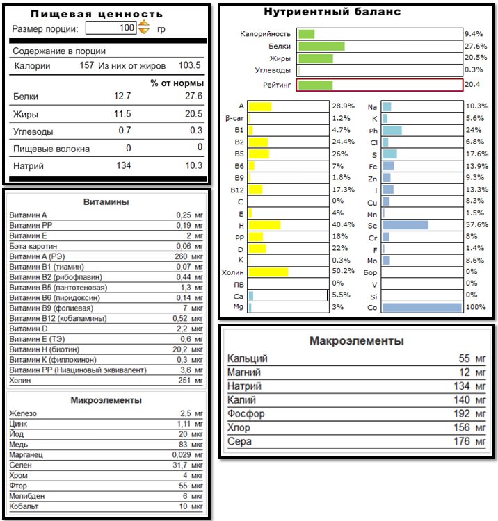 - ΠΏΠ΅ΡΠ΅ΠΏΠ΅Π»ΠΈΠ½ΠΎΠ΅ ΡΠΉΡΠΎ : 79 ΠΊΠ°Π»ΠΎΡΠΈΠΉ, 6,5 Π³ Π±Π΅Π»ΠΊΠ°, 5,5 Π³ ΠΆΠΈΡΠ° (1,8 Π³ Π½Π°ΡΡΡΠ΅Π½Π½ΡΡ ), 132 ΠΌΠ³ Ρ ΠΎΠ»ΠΈΠ½Π°, 422 ΠΌΠ³ Ρ ΠΎΠ»Π΅ΡΡΠ΅ΡΠΈΠ½Π°