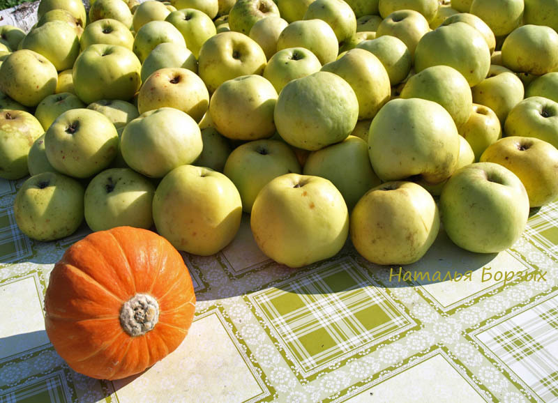 Отличительным свойством яблок антоновка можно назвать их длительный срок хранения (около 3 месяцев), поэтому собранный в середине сентября урожай может радовать вас своим ароматом практически до самого Нового года. При съеме цвет кожуры у яблок зеленовато-желтый, который за время хранения изменяется на желтый. Мякоть у яблок антоновка также отличается желтоватым оттенком, она очень кисло-сладкая и очень сочная.